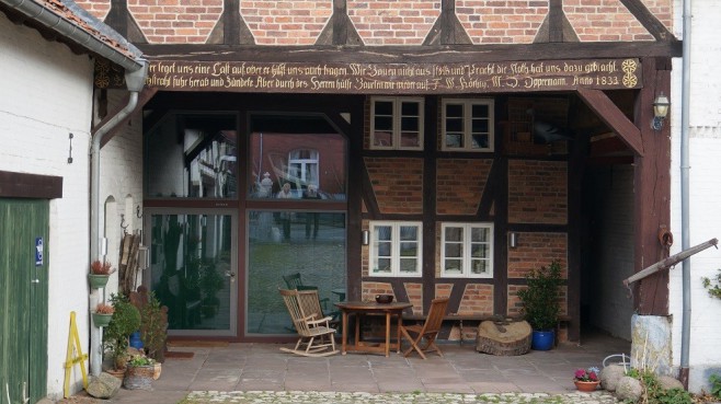 Wir bauen nicht aus Stolz und Pracht, Feuers Noth hat uns dazu gebracht. Durch einen Wetterschlag am 21. Juni Anno 1828. I.C. Oppermann, I.D. Oppermann Umgebaut 1972 – 1974 Herta und Hans Joachim